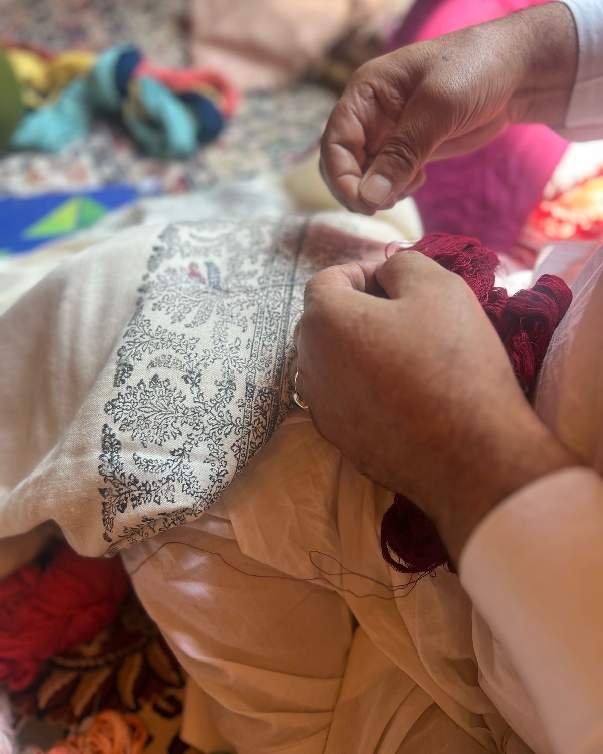 Women artisans hand-spin each strand on a traditional spindle, a meditative process that produces yarn of extraordinary fineness.